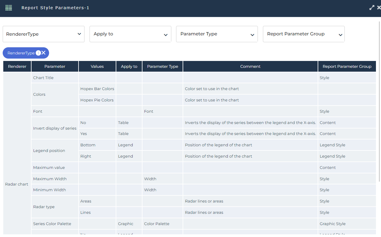 Example: in the RendererType filter select "Radar chart" to display the radar chart renderer information only.