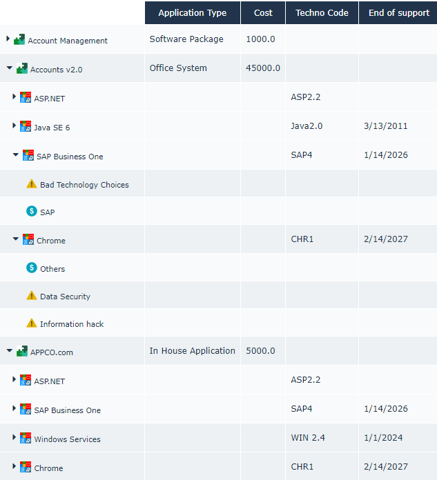 The "Application" TreeSet Definition structure is based on "5* Applications-Root" root TreeSet Collection with the "Technologies used" TreeSet Collections child and with "Application Type" and "Cost" TreeSet Properties.