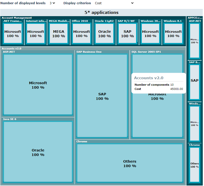 E.g.: this Breakdown map is based on "Account Management", "Accounts V2.0", and "APPCO.COM" applications, which all have a ranking of 5 stars. For each of them, its Technologies are displayed.