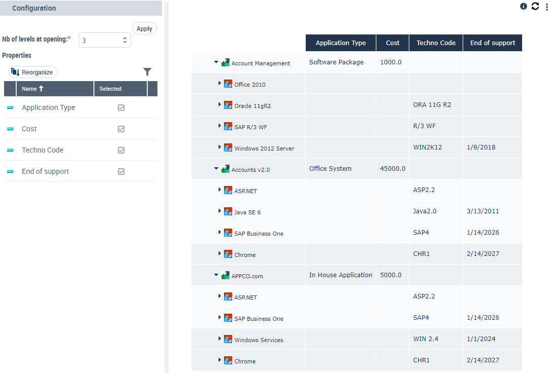It also displays Properties: "Application Type" and "Cost" values of each application, and "Techno Code" and "End of support" date of each technology.