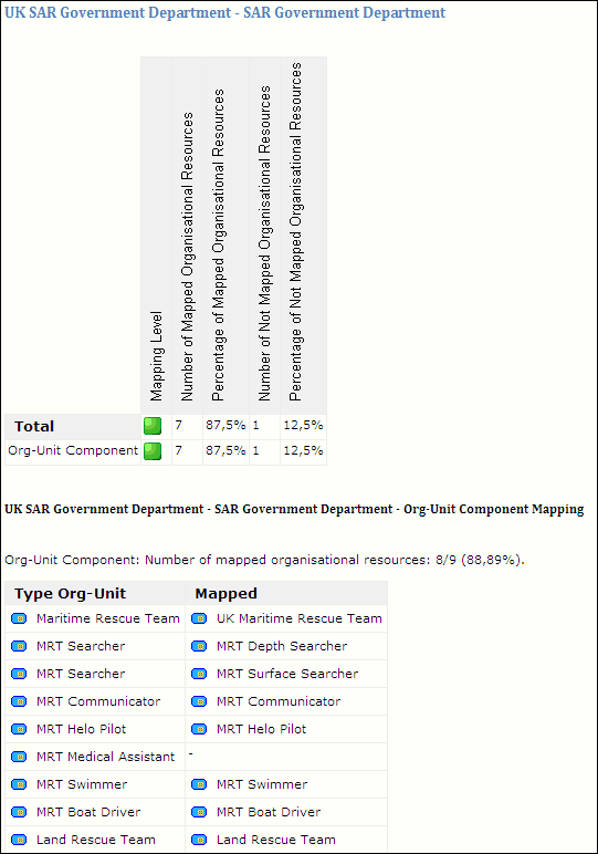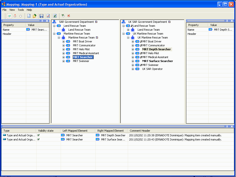 In the figure below, the two middle columns contain the generic and the actual org-units: "types" to left and "actual" to the right. The generic "SAR Government Department" organization is mapped to the "UK SAR Government Department" (mapping not indicated) and the "MRT Searcher" org-unit component type is mapped to the "MRT Depth Searcher" and the "MRT Surface Searcher" org-unit components.