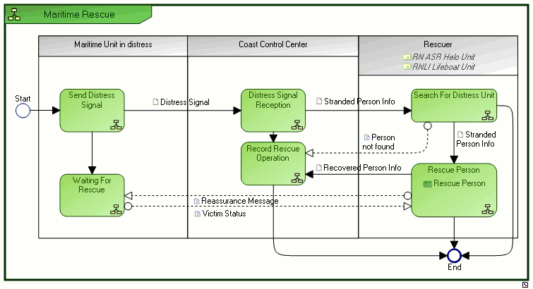 The figure below illustrates the "Maritime Rescue" system process which is involved in the performance of several tasks. These tasks are placed on the different participants which are more or less responsible for carrying them out. The different information exchanged between the tasks and the corresponding data flow is indicated in the diagram.