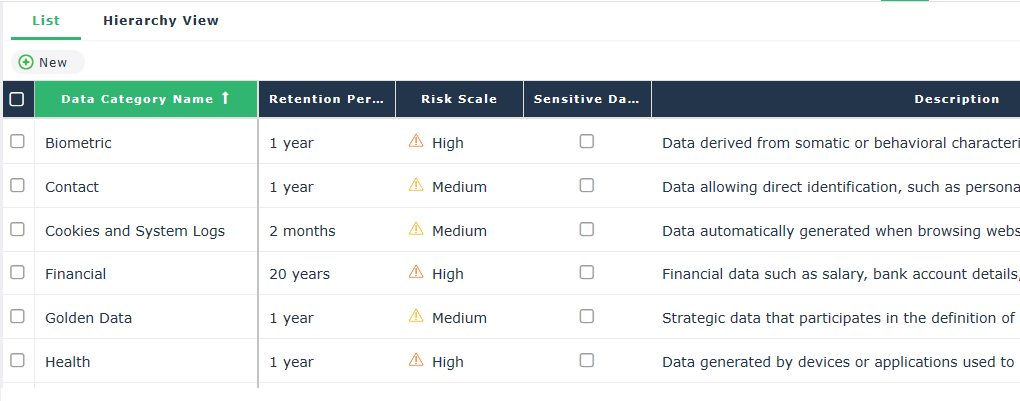 • the Risk scale: default risk level associated to the data category (eg. "high" for financial data).