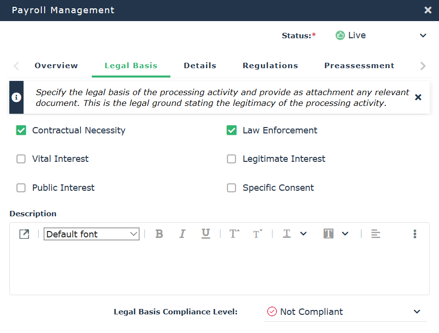There has to be at least one legal basis selected. If there is no legal basis for the processing activity, the processing activity is considered poorly compliant.