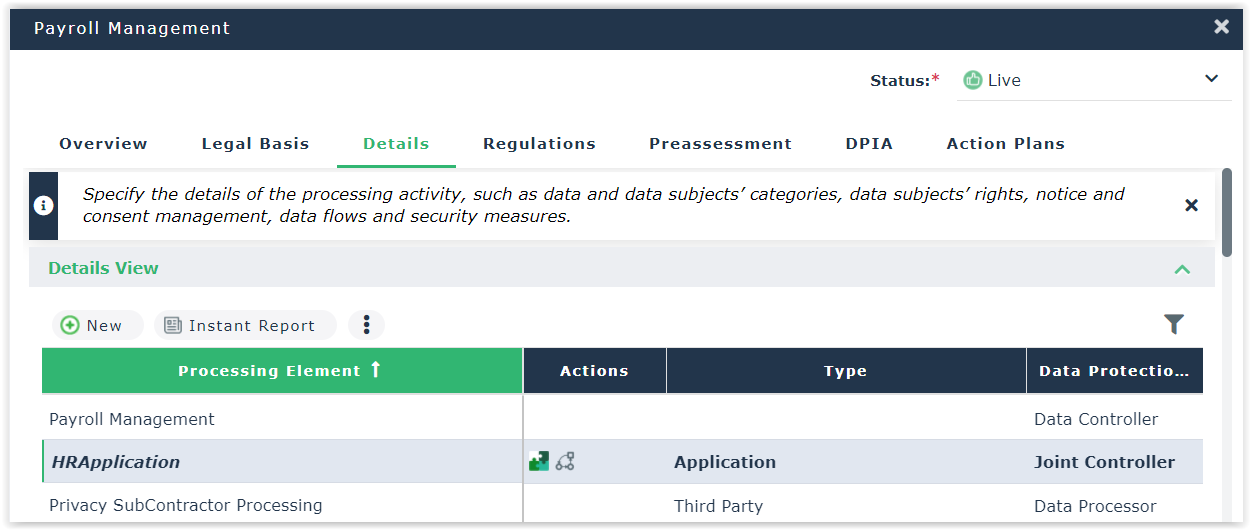 Every processing activity needs to be described at a general level. Yet, it may be useful to create processing elements if you use an IT application or a third-party to process your activity.