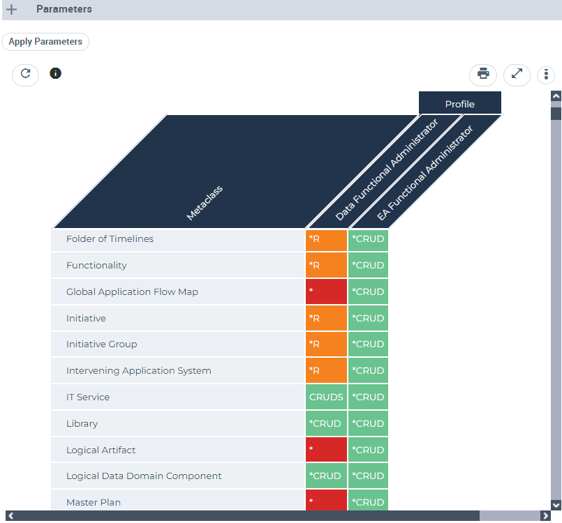 E.g. the permission comparison report of Application Portfolio Manager and ITPM Functional Administrator, here you can see the permissions of some of the MetaAttributes of Application MetaClass.