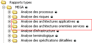 Les rapports types propres à MEGA Architecture on HOPEX concernent différents domaines; les architectures applicatives, les architectures orientées services (SOA), les contraintes temporelles qui agissent sur le SI etc.