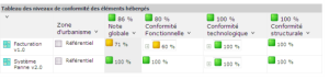 Le dernier tableau affiche les niveaux de conformité par zone d'urbanisme. Dans l'exemple ci-dessous, la zone "Référentiel" affiche une complétude fonctionnelle de 71%, qui s'explique par le fait que deux des fonctionnalités requises pour la zone ne sont pas implémentées par les applications de la zone.