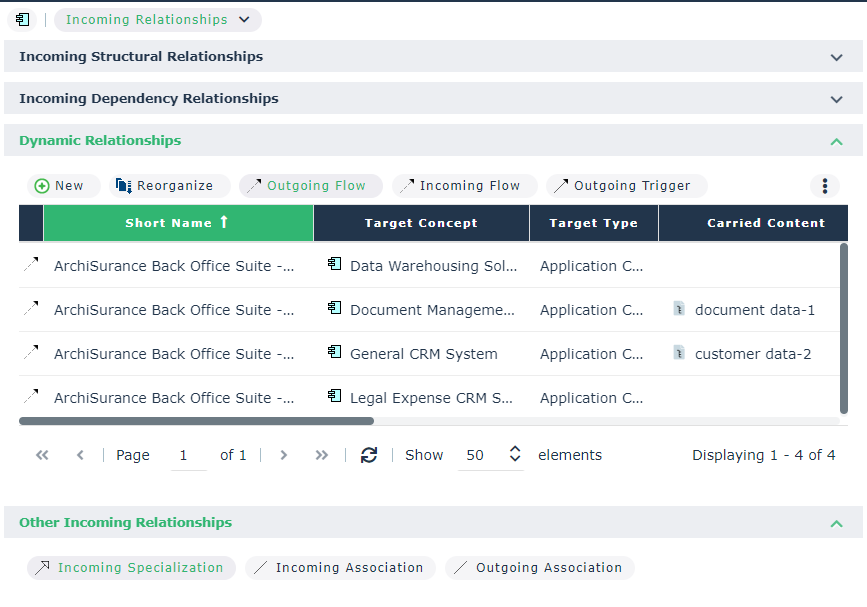 • the Outgoing Relationships property page provides access to outgoing relationships of the various types presented in separate sections