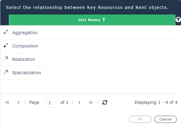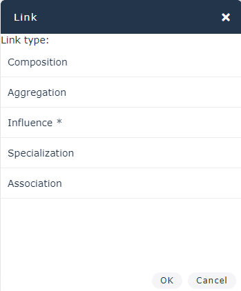 When creating a relationship, a dialog box displays the list of possible relationship types available between the two elements in the current viewpoint.