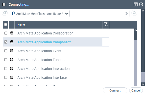 Only the types mentioned in the table below are available with the HOPEX for the ArchiMate Framework standard. The other possible types, available in HOPEX, are not compliant with the ArchiMate Standard.