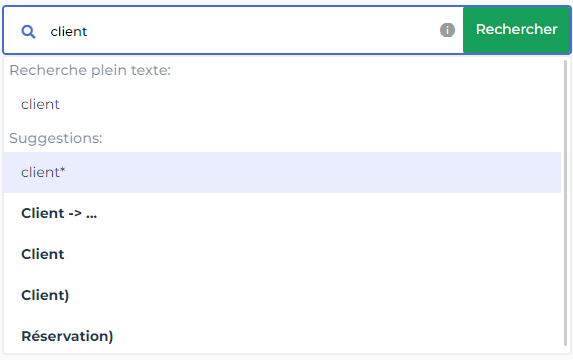 Par exemple, si "Réservation" est associé à "Client", lors d'une recherche sur "Client", "Reservation" apparaît aussi dans les résultats.