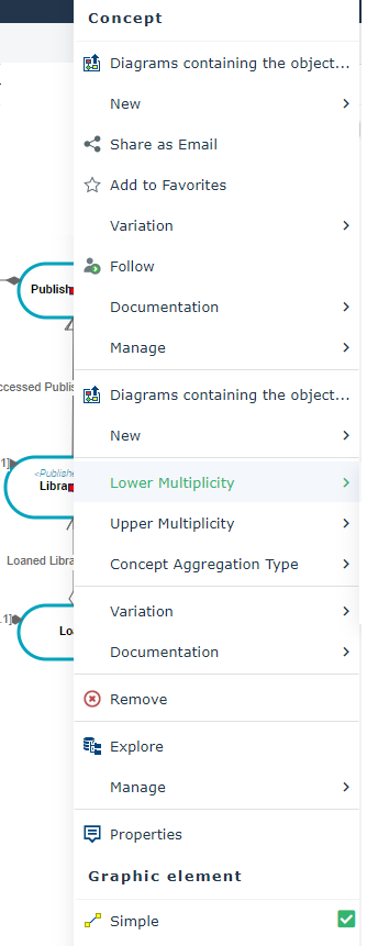 Le menu contextuel d'un lien de type Composant de concept, par exemple, présente :