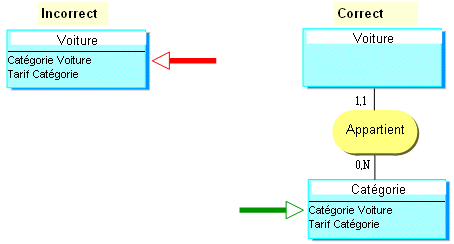 Si le "Tarif Catégorie" est porté par l'entité "Voiture", cela signifie que deux voitures de la même catégorie peuvent avoir un "Tarif Catégorie" différent. Pour éviter cela, il faut créer une entité "Catégorie" qui portera le tarif.