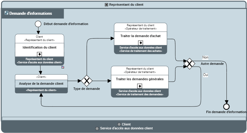 Le diagramme d'interface de service associé à l'interface de service “Identification du client” décrit, dans un formalisme BPMN, les opérations réalisées.