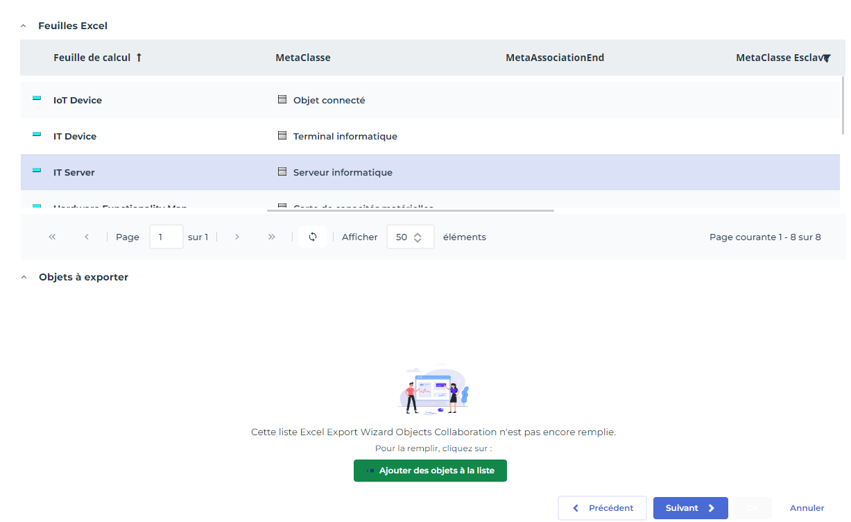 6. Dans la section Feuille Excel, sélectionnez le type d'objet que vous souhaitez exporter et, dans la section Objets à exporter, cliquez sur Ajouter des objets dans la liste.