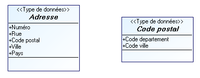 Ici le type Adresse est composé du numéro, de la rue, du code postal, de la ville et du pays.