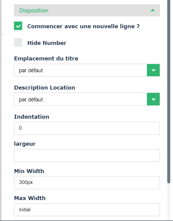 La section Disposition sur chaque question propose les possibilités suivantes en complément :