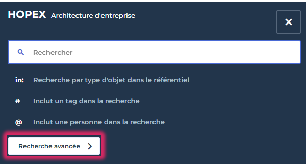 Les recherches avancées sont des recherches réalisées au moyen de requêtes. Lorsque vous effectuez une recherche avancée, vous devez au préalable sélectionner le type d'objet auquel votre recherche s'applique. Paramétrez ensuite votre recherche avancée au moyen :