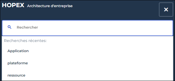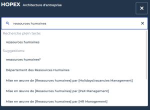 Les Solutions et produits HOPEX permettent d'effectuer des recherches plein texte parmi tous les objets du référentiel, à condition que celui-ci soit indexé. L'outil de recherche plein texte vous permet d'explorer votre référentiel grâce à la saisie de termes et d'opérateurs.