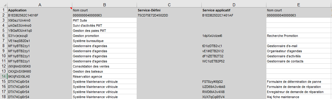 Dans la colonne A : la liste des applications, par leur identifiant absolu.