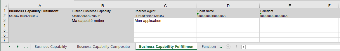 • Les mises en œuvre de capacités métier par des applications dans la feuille "Business Capability Fulfillment"