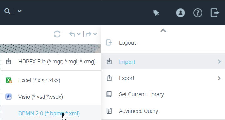1. In HOPEX, select Main Menu > Import > BPMN 2.0 (*.bpmn, *.xml).