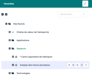 Les favoris fournissent un accès rapide aux objets consultés régulièrement. Ils permettent d'accéder à l'ensemble des actions possibles sur ces objets. Les favoris sont utiles lorsque votre référentiel est volumineux et vous font gagner un temps de navigation précieux.