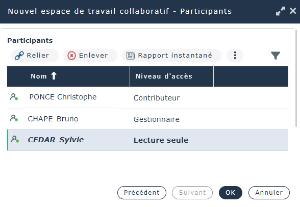 La ou les personnes sont ajoutées à la liste des participants à l'espace de travail collaboratif avec le niveau d'accès Lecture seule.
