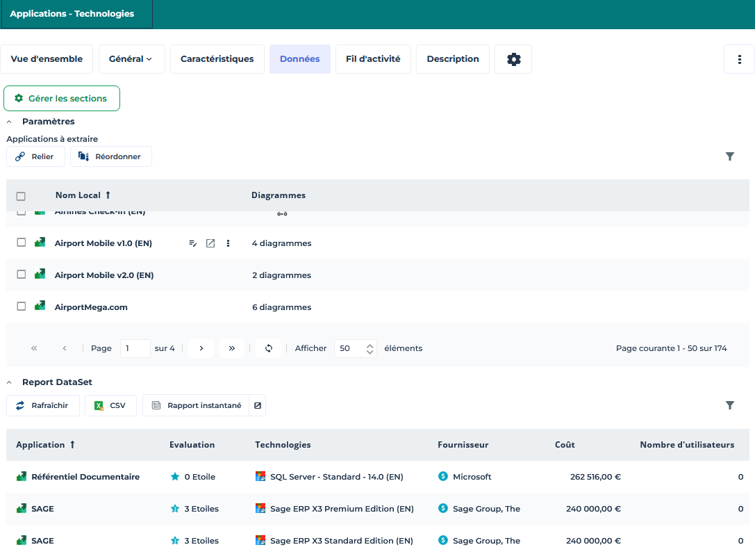 Exemple, un Report DataSet qui a pour définition "Applications - Technologies" contient pour chaque application sélectionnée (objets à extraire) les données suivantes :