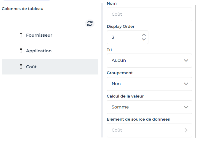colonne "Coût" : champ Calcul de la valeur sélectionnez "Somme" pour afficher la somme des coûts par "Fournisseur".
