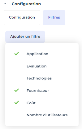 • Dans la section Configuration, l'onglet Filtres permet d'ajouter un filtre personnalisé sur chacune des cellules du tableau.