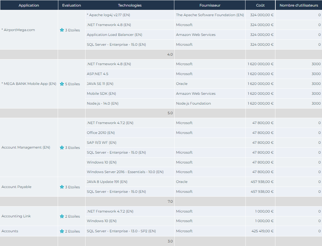 Le résultat du rapport ainsi défini présente les applications triées par niveau d'évaluation descendant. A chaque changement de niveau une rupture indique le nombre de technologies contenues dans ce niveau d'évaluation.