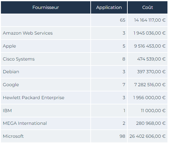 Le résultat du rapport présente les fournisseurs trier par ordre alphabétique et pour chaque fournisseur indique le nombre d'applications et le coût total.