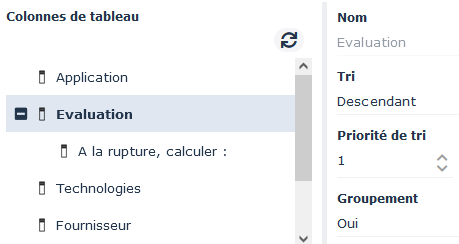 Exemple 1 : à partir d'un Report DataSet qui a pour définition "Applications - Technologies", colonne "Evaluation" : champ Tri, sélectionnez "Descendant" pour trier les applications par niveau d'évaluation, de la mieux notée à la moins bien notée.