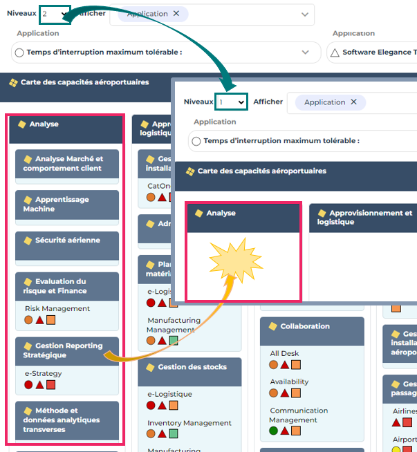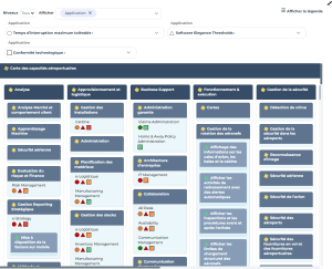 Le filtre "Capacités couvertes par des briques de solution", que vous pouvez ajouter aux briques d'architecture, permet d'afficher uniquement les capacités couvertes par des applications (briques de Solution).