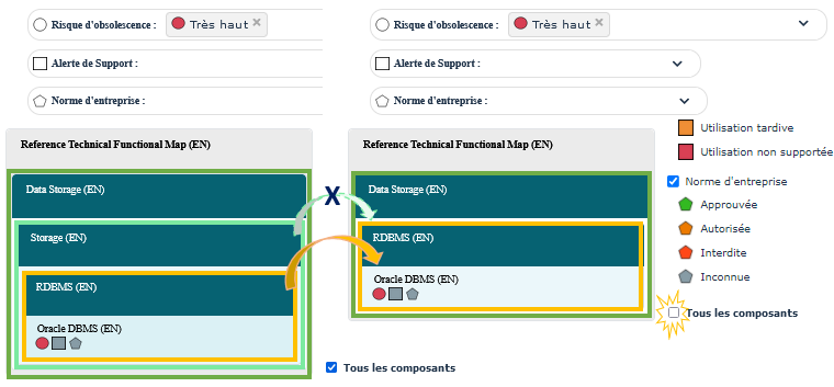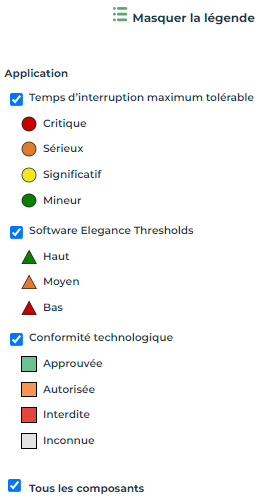 • Pour alléger l'affichage lors d'un filtrage, vous pouvez masquer les composants intermédiaires qui ne correspondent pas au filtrage, mais présents car ils contiennent des composants qui correspondent au filtrage: dans la légende, désélectionnez Tous les composants.