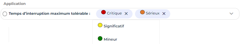 Le critère "Temps d'interruption maximum tolérable" d'une application est représenté par un cercle.
