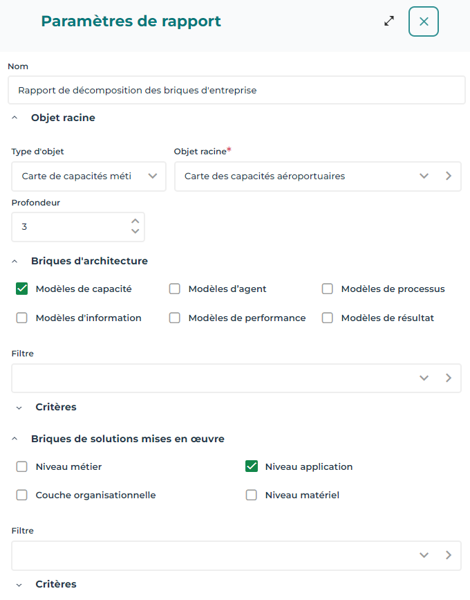 Le rapport type "Rapport de décomposition des briques d'entreprise" détaille la répartition d'un Objet racine (ex. : la carte de capacité métier "Carte des capacités aéroportuaires") en fonction d'objets classificateurs choisis :