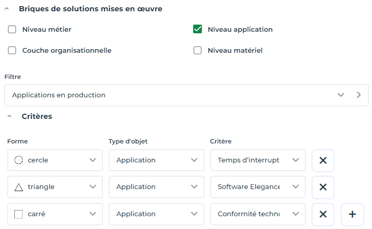 Le filtre "Applications en production", que vous pouvez ajouter aux briques de solutions mises en œuvre, permet d'afficher uniquement les applications qui sont en production.