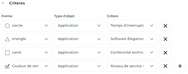 • Dans la colonne Forme, sélectionnez le symbole qui représente le critère, ou sélectionnez "Couleur de remplissage" pour mettre en évidence ce critère au niveau du nom de l'objet (couleur de fond).