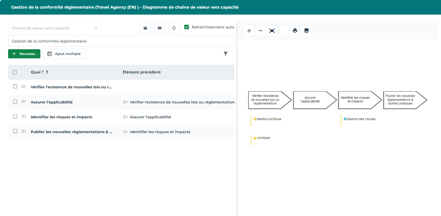 Ce diagramme permet d'initier très facilement un diagramme de chaîne de valeur en créant les étapes de chaîne de valeur et les liens qu'elles ont avec les différentes capacités métier.