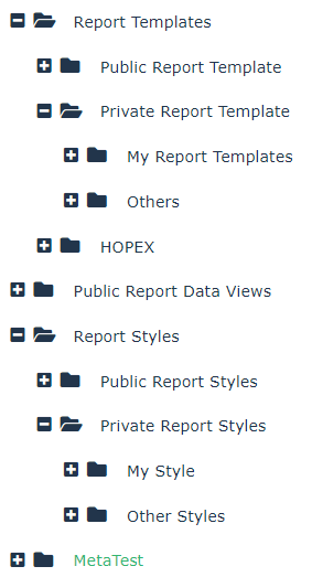 • Report Templates, where the Report Templates are classified by their sharing characteristics (Private or Public). You can add sub-folders for a more precise Report Template classification. The HOPEX folder includes standard Report Templates.