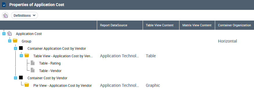 For example, the "Application Cost" Report Chapter includes two Report Data Views showing a Table and a graphic on the same row (Group Container Organization: "horizontal")