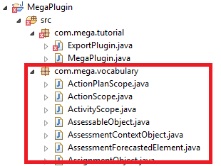 A package "com.mega.vocabulary" is created containing classes corresponding to declarations of selected MetaClasses as well as their inherited MetaClasses: