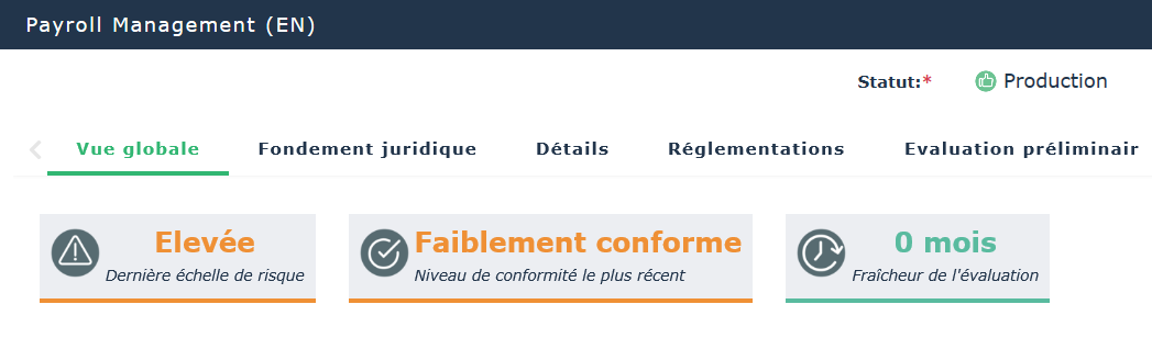 Après avoir réalisé la DPIA, le tableau de bord de l'onglet Vue globale de la page du traitement affiche des données qui prennent en compte les résultats de la DPIA.