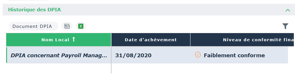 1. Dans l'onglet DPIA de la page de propriété d'un traitement, dépliez l'onglet Historique des DPIA.