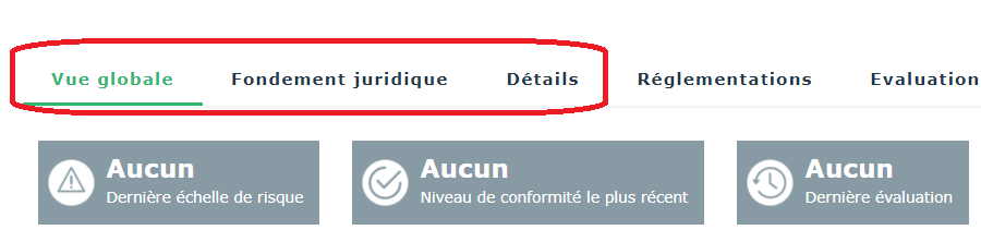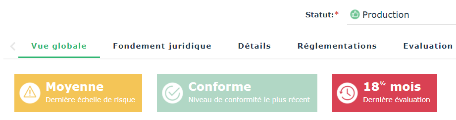L'information affichée prend en compte les évaluations réalisées au cours des évaluations préliminaires et des analyses d'impact (DPIA). Ce tableau de bord est vide jusqu'à ce que l'équipe Privacy commence l'évaluation du traitement.