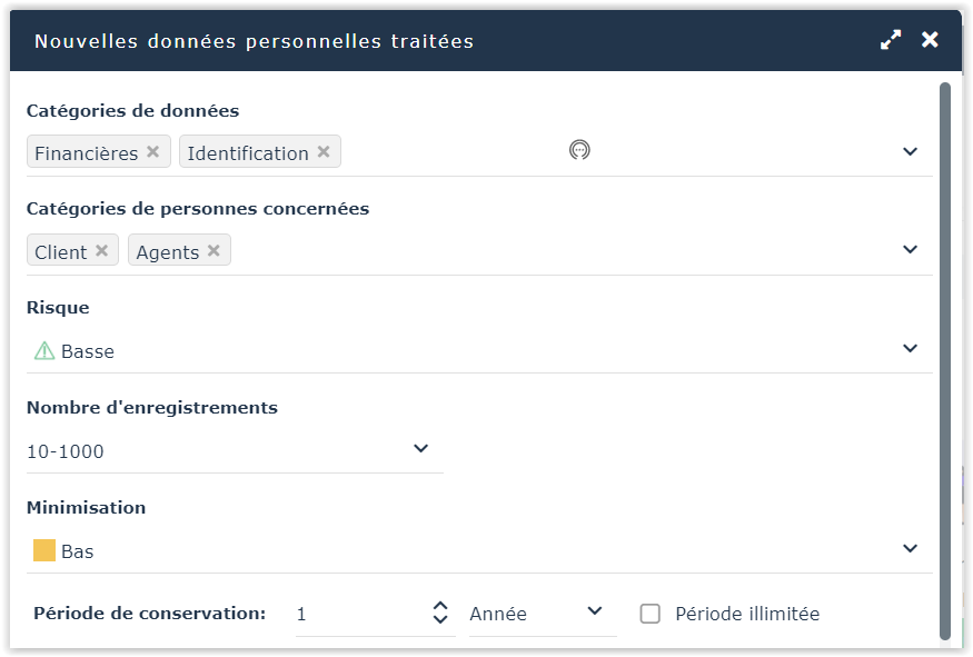 A la création de données à caractère personnel, le niveau de Risque est automatiquement calculé à partir de l'échelle de risque la plus haute spécifiée par le responsable de la confidentialité dans la section Éléments clés (pour les catégories de données et les catégories de personnes concernées).