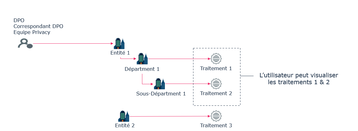 Un utilisateur qui est affecté à une entité juridique ou à un département peut accéder aux traitements associés aux sous-entités juridiques ou sous-départements.